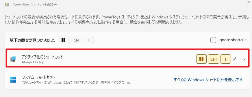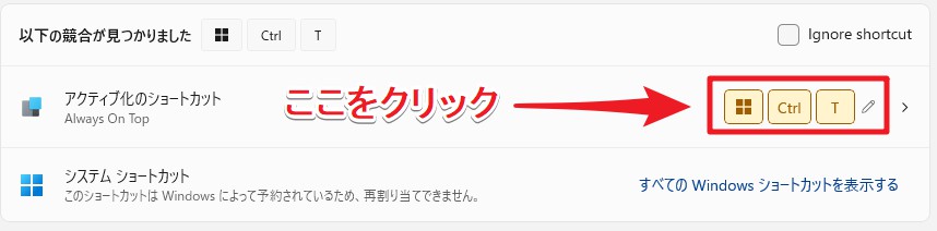 以下のイラストのように、私の環境では、上記の「Always On Top」に割り当てられたショートカットである「Win」+「Ctrl」+「T」がシステムショートカットと競合(喧嘩)していることが分かります。